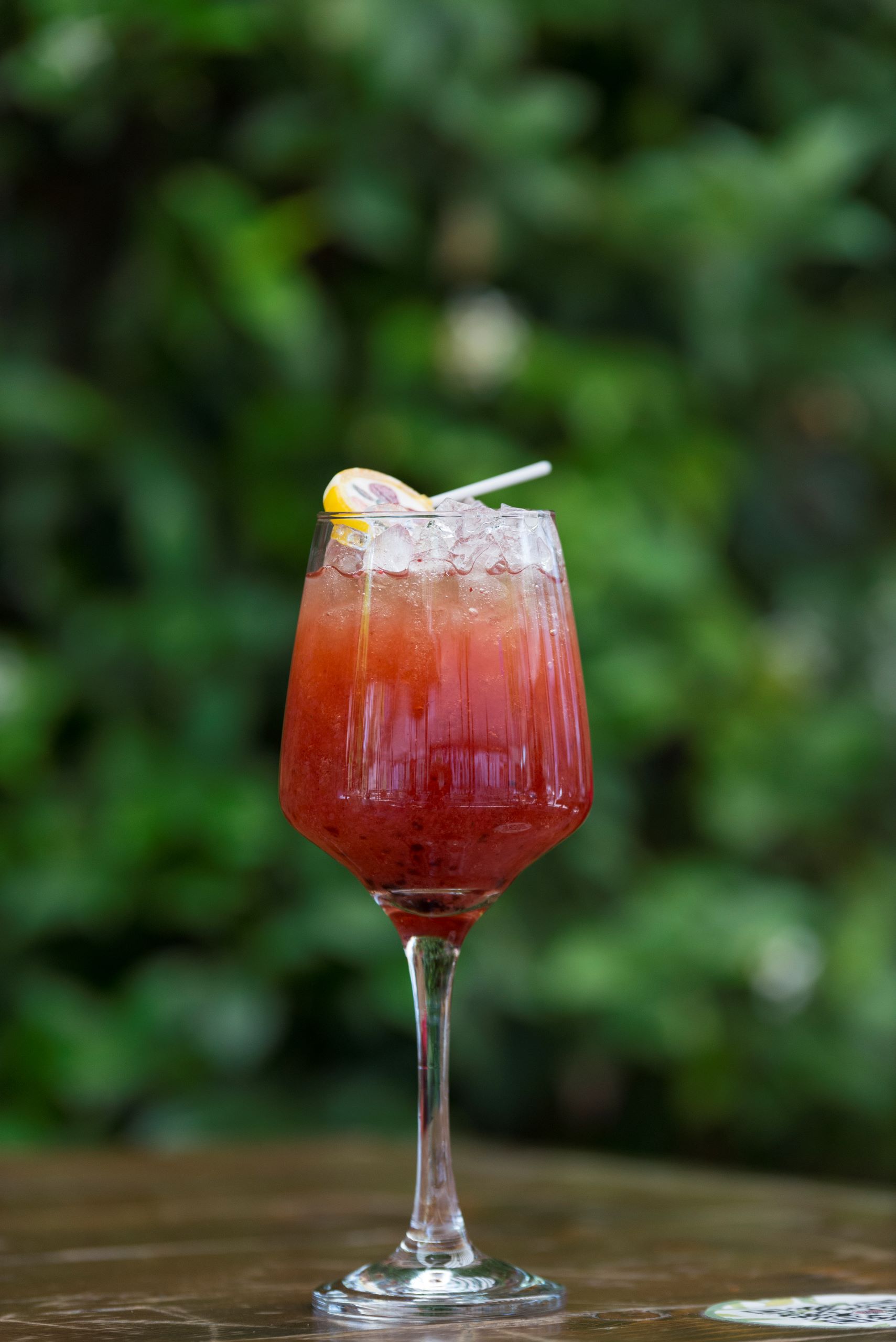 Strawberries, lemon, balsamic cream, herbal liqueur, peach, Finlandia Vodka, oleo saccharum, lollipop.